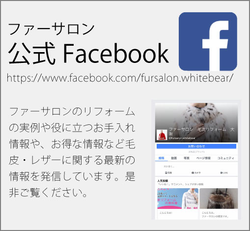 | 毛皮リフォーム ファーサロン 住所:大阪市浪速区大国1-1-1 電話:06-6641-3795 Free-phone:0120-934-494 | ||||||||||||||||