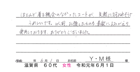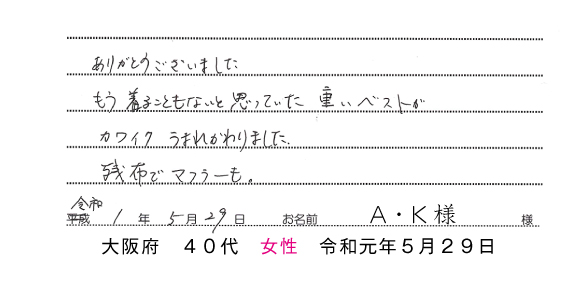 | ・肩幅&身幅つめ | ・袖丈&着丈つめ | ・破れ直し | ・クリーニング | |||||||||||||